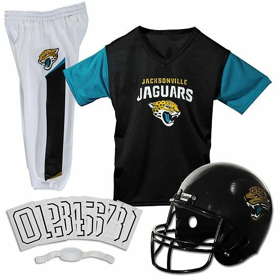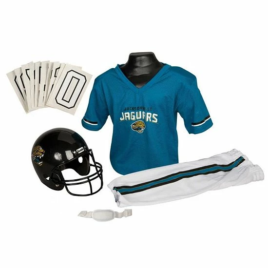 With team graphics on the jersey and pants, this Franklin Sports Jacksonville Jaguars football uniform offers an authentic NFL feel. In blue/multi.