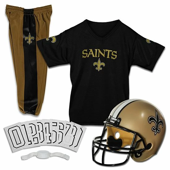 With team graphics on the jersey, pants and helmet, this Franklin Sports New Orleans Saints football uniform offers an authentic NFL feel. In black/gold.