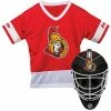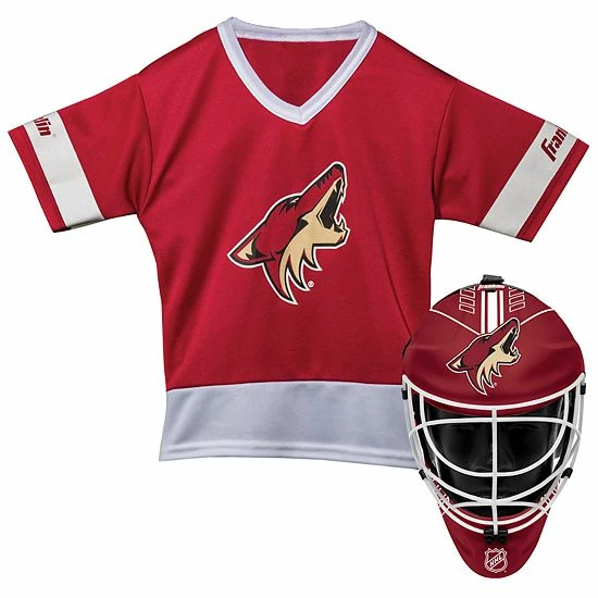 Let your aspiring hockey great gear up in their favorite NHL team colors with this Arizona Coyotes costume goalie face mask and jersey set from Franklin Sports.