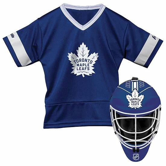 Let your aspiring hockey great gear up in their favorite NHL team colors with this Toronto Maple Leafs costume goalie face mask and jersey set from Franklin Sports.
